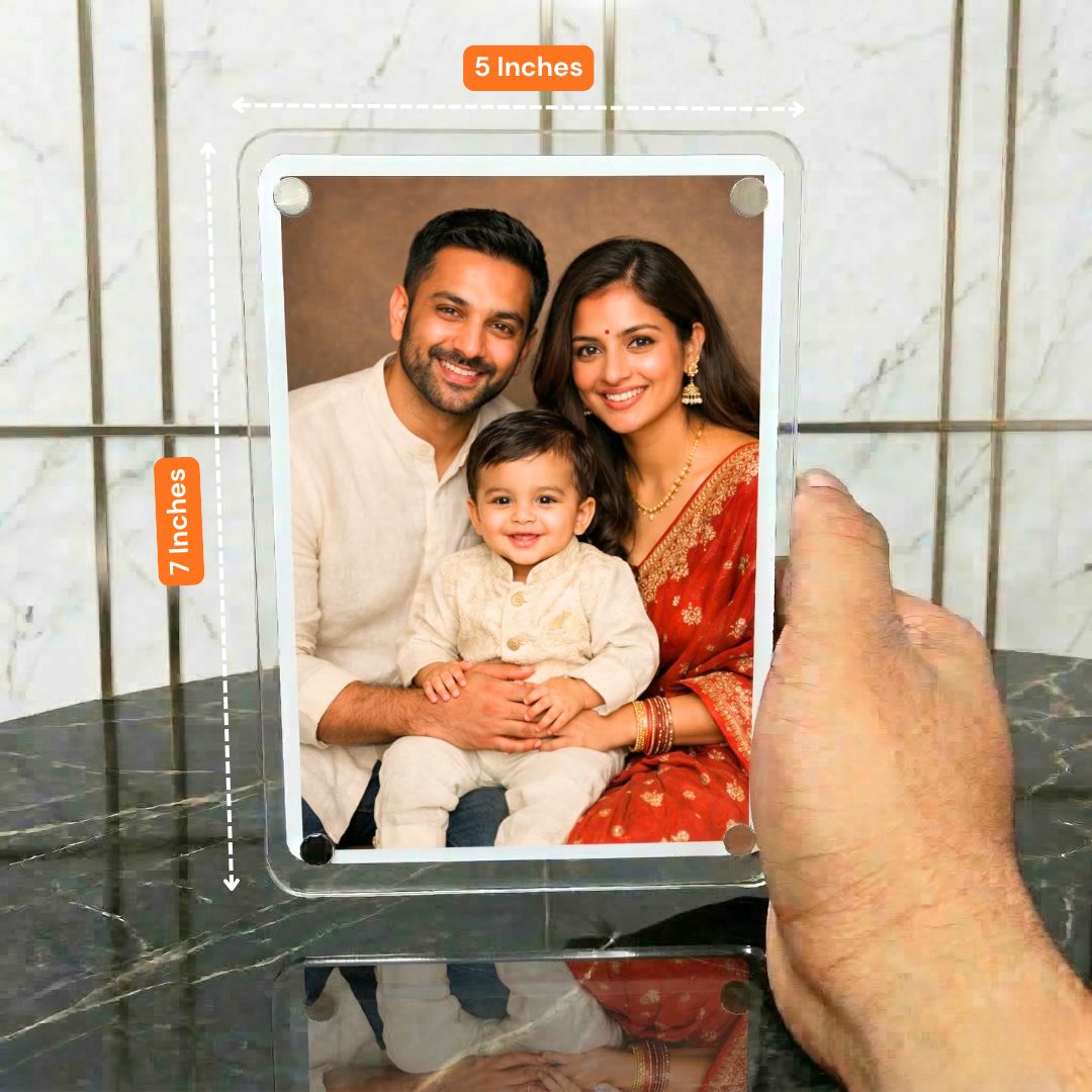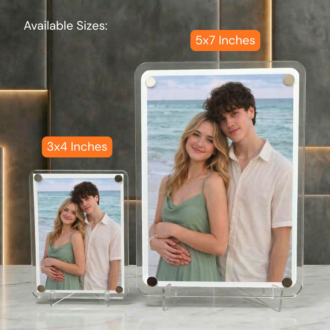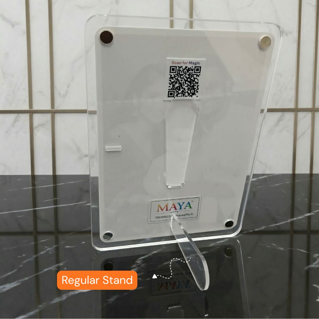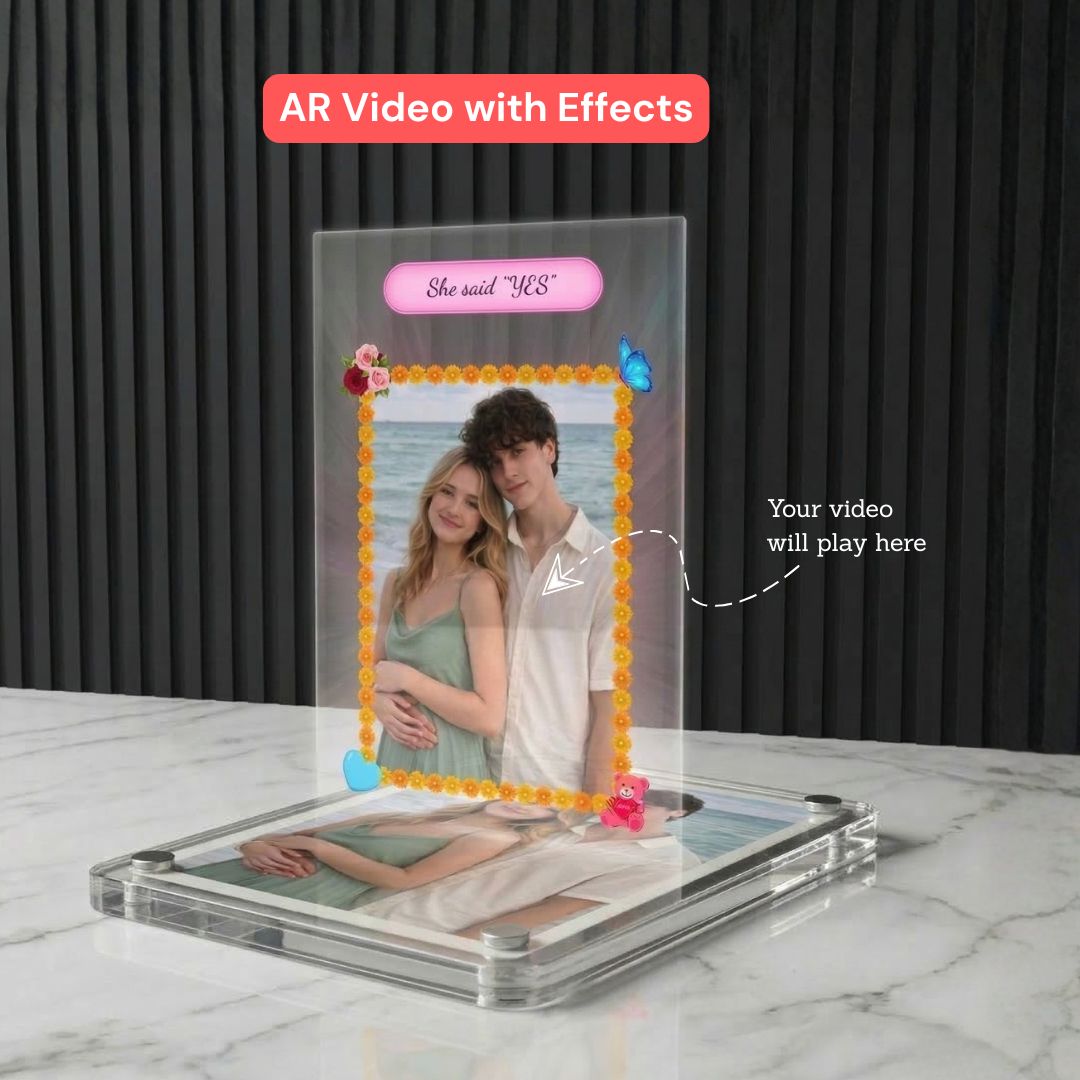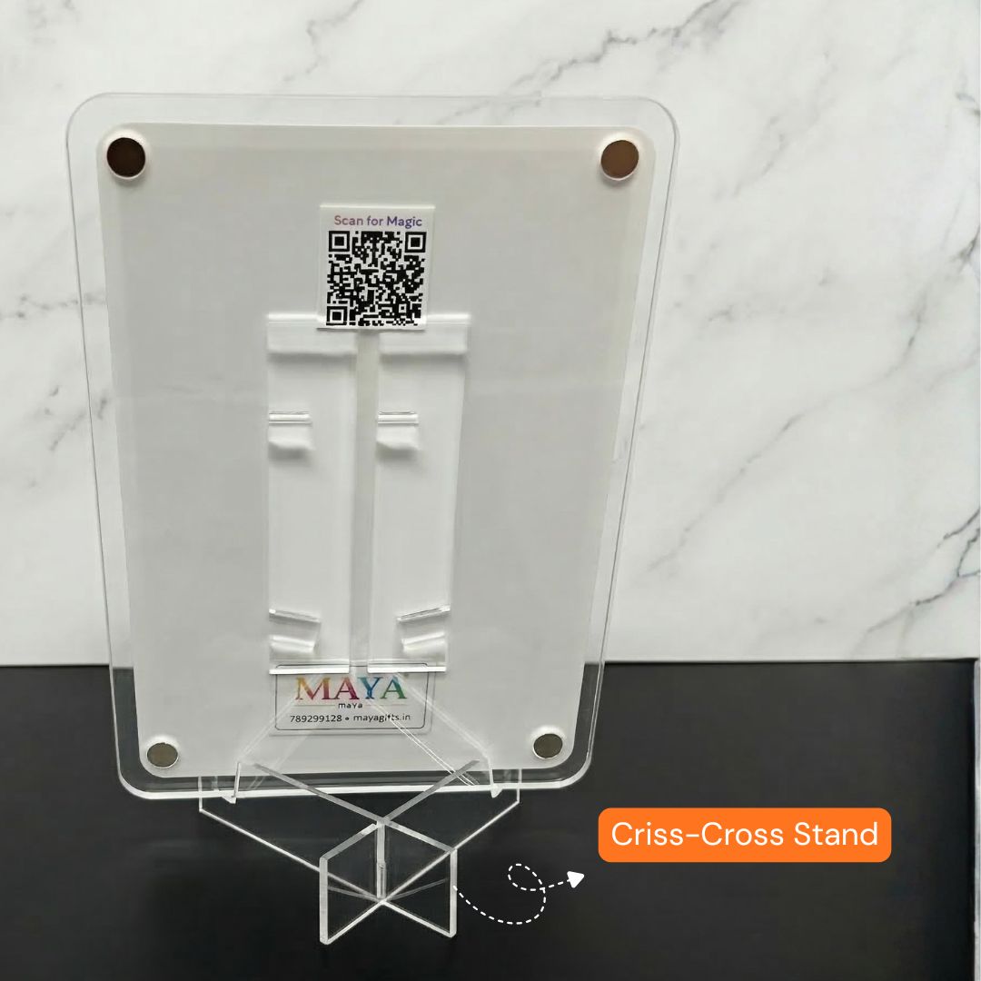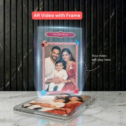 Display your special moments in style with this premium acrylic Polaroid photo frame. Made from high-quality acrylic, it can stick to your fridge as a magnet or stand on your table as a stylish photo display. The real magic begins when you scan the QR code and show the card to your camera – your photo comes to life through a unique Augmented Reality (AR) experience.